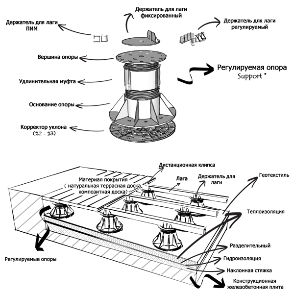 Система опор Support® предлагает идеальные решения для превращения террас в пригодную зону для жилья. Опоры Support® вы можете использовать под каменную плитку, террасную доску а так же под ОСБ и стекло, и регулировать высоту от 15 мм до 1200 мм